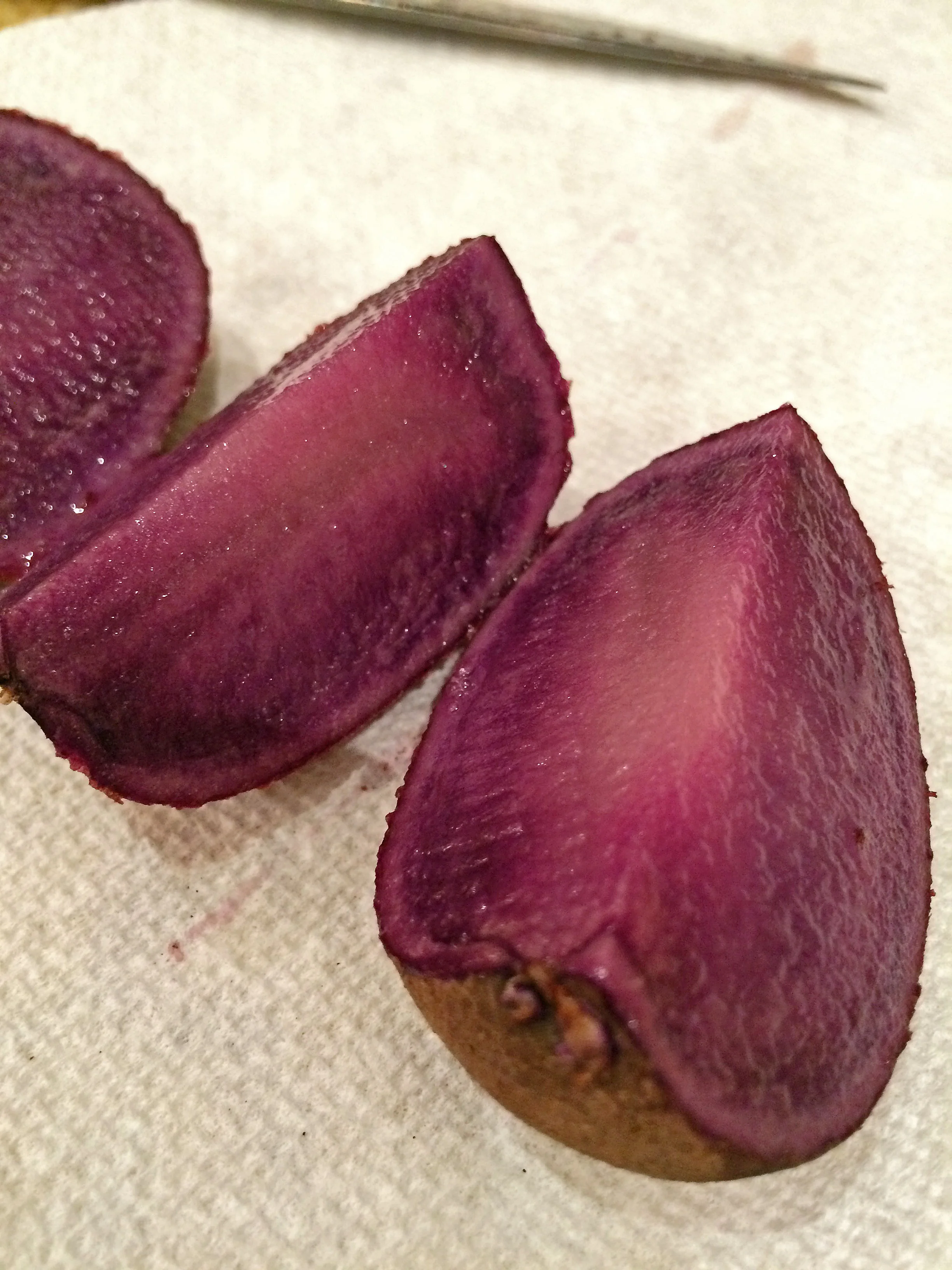 Let’s brighten up the week with these colorful Adirondack blue potatoes and golden potatoes. I found an amazing display of baby potatoes at the Union Square Greenmarket and decided that roasted potatoes are exactly what I need to make as a side dish for dinner. I just can’t get enough of these colors!